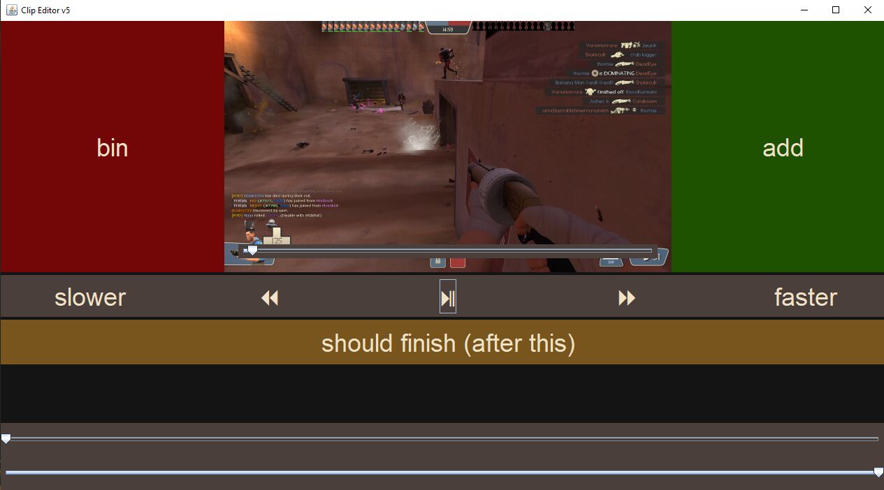 The fifth iteration of my specialized video editing software. Back when I used Windows and NVIDIA ShadowPlay, I collected a couple thousand clips from Team Fortress 2, Counter-Strike and Minecraft, so existing software was way too slow to actually get through all those clips in a reasonable amount of time. It's just a shame that displaying video is so impossible in C/Odin...