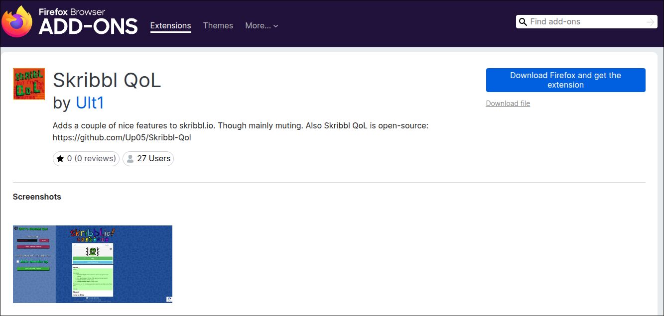 My first (and only public) Firefox Addon. It adds various small quality-of-life features to the game skribbl.io, like downloading the canvas and muting players (back when I used to play it, there was, to my knowledge, no chat moderation, so some people were very annoying.