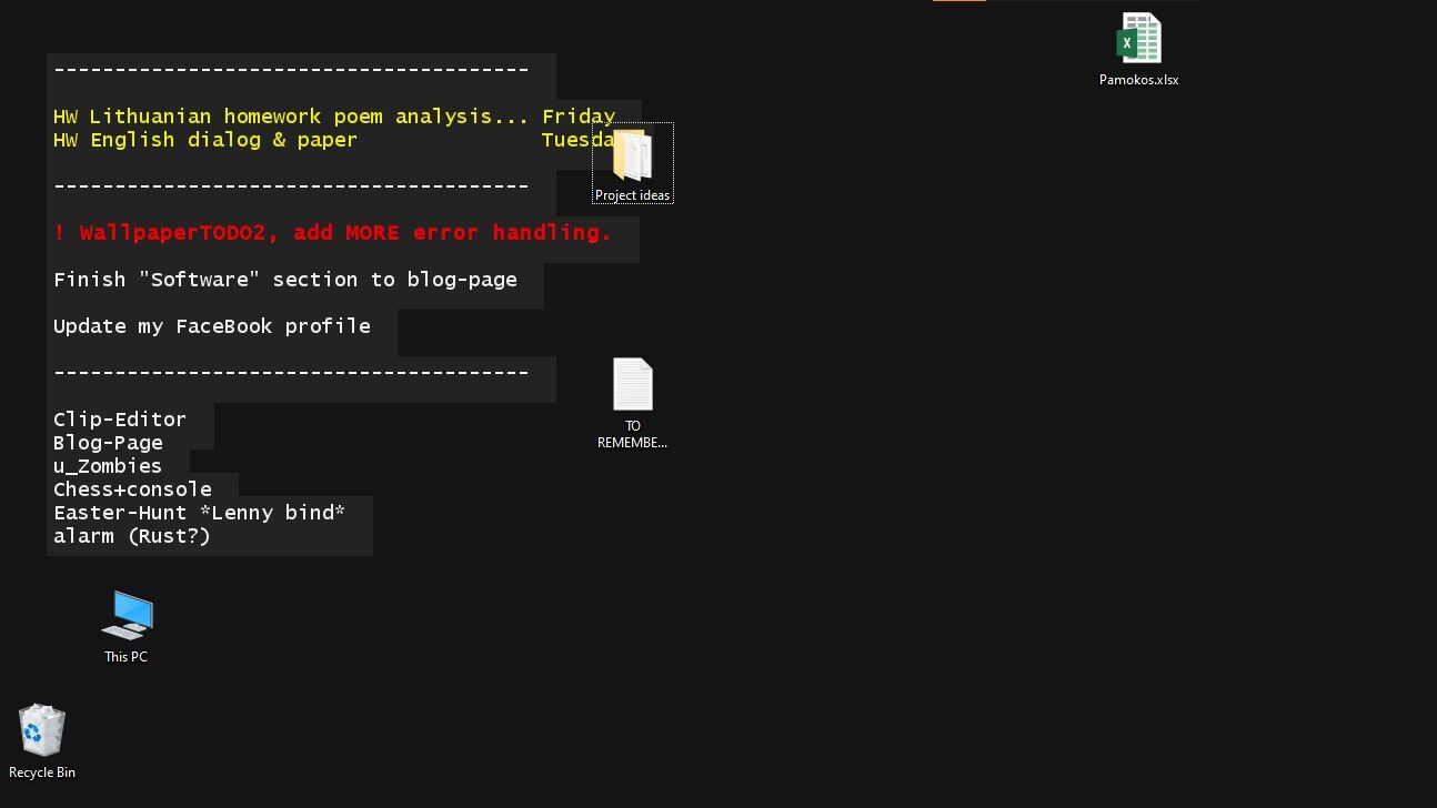 A VERY old project for Windows, written in Java and a bit of C++, that lets you put text, like notes or TODOs, on your wallpaper. I used it right up until I switched to Linux... It lets you have several profiles with different wallpaper images or (as shown in demo, plain colors). It has some basic formatted text (that may also be specified by the user) and a few more features.