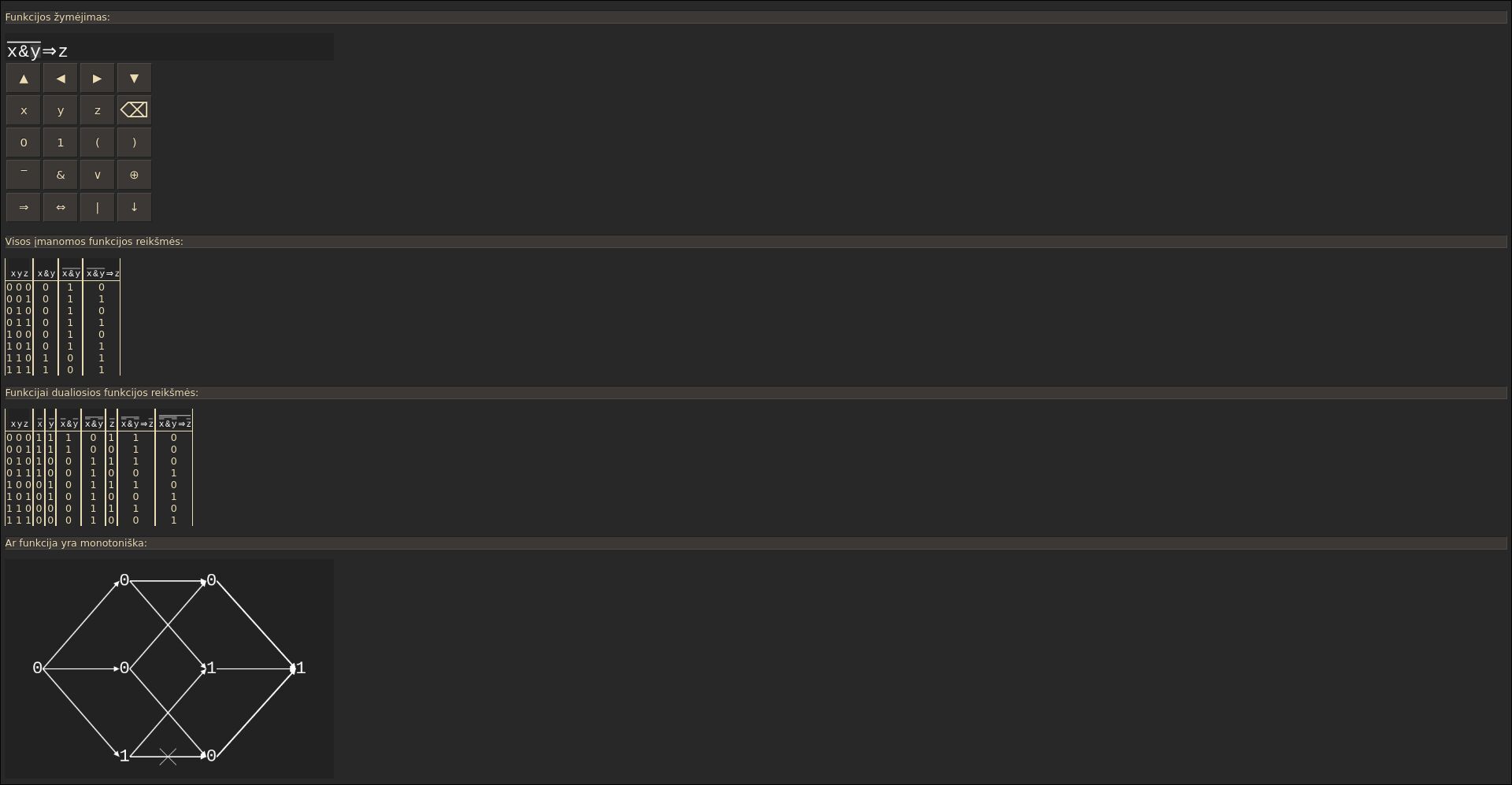 Fast and simple algebraic boolean calculator with our notation I made when we were learning discrete mathematics. It parses the user input (obviously) with a basic Pratt parser, visualizes whether the function is monotonic, calculates all of its possible results and its complement (or whatever is the translation of „dualioji funkcija“)