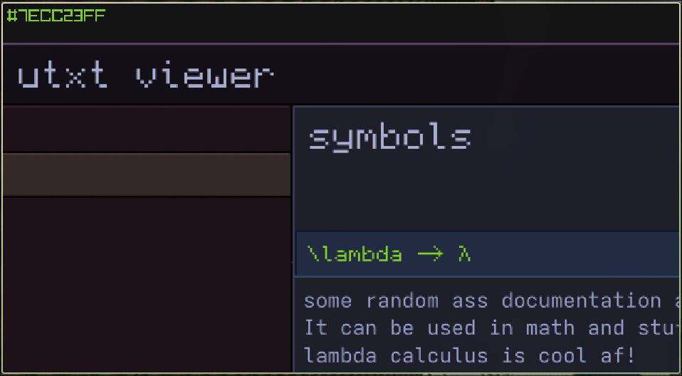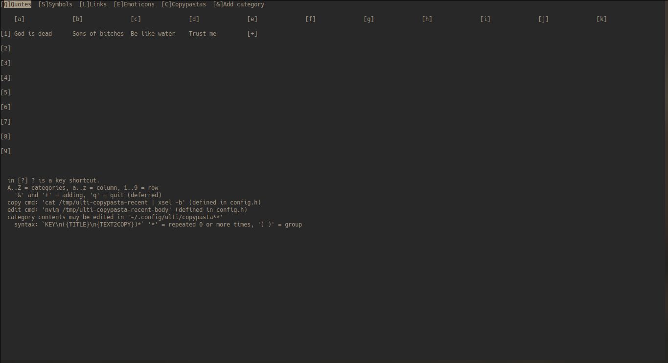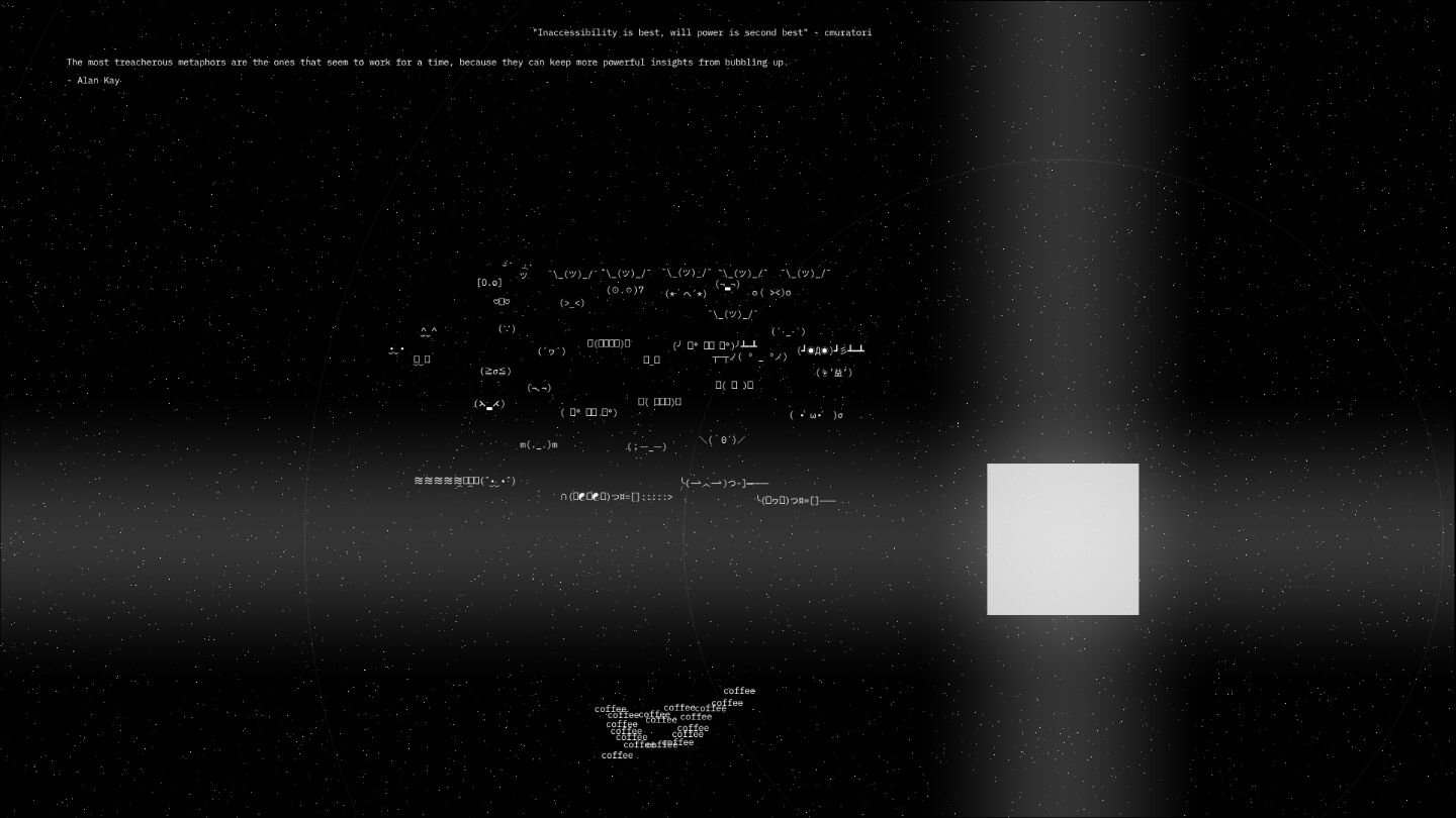 A graphical persistent clipboard for various emoticons/quotes/symbols I found. The background is rendered with shaders and is, basically, just an infinite plane. I (at the time of writing, literally just now) added nanovg to support more unicode characters than base Raylib allows.