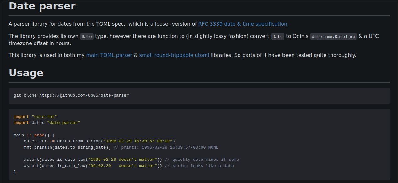 An RFC3339 date parser for the Odin programming language. I learned this also exists in the standard library, but I think, my library is a bit better! Plus, it has extra functionality. I have used this library in both my TOML parsers. It just works.