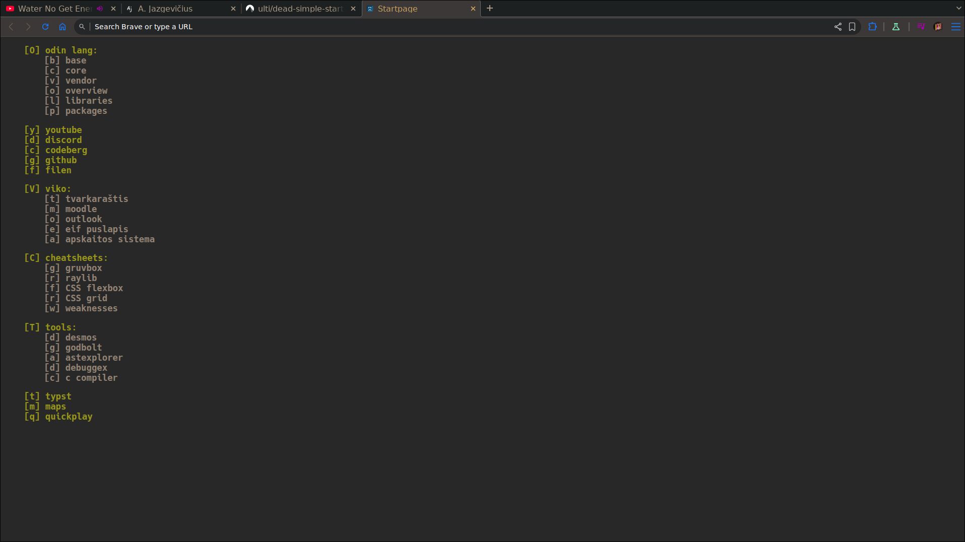 My all-time-favourite startpage keyboard-centric startpage. Capital letters select "directories"/"groups" and lowercase ones travel to the associated link.
