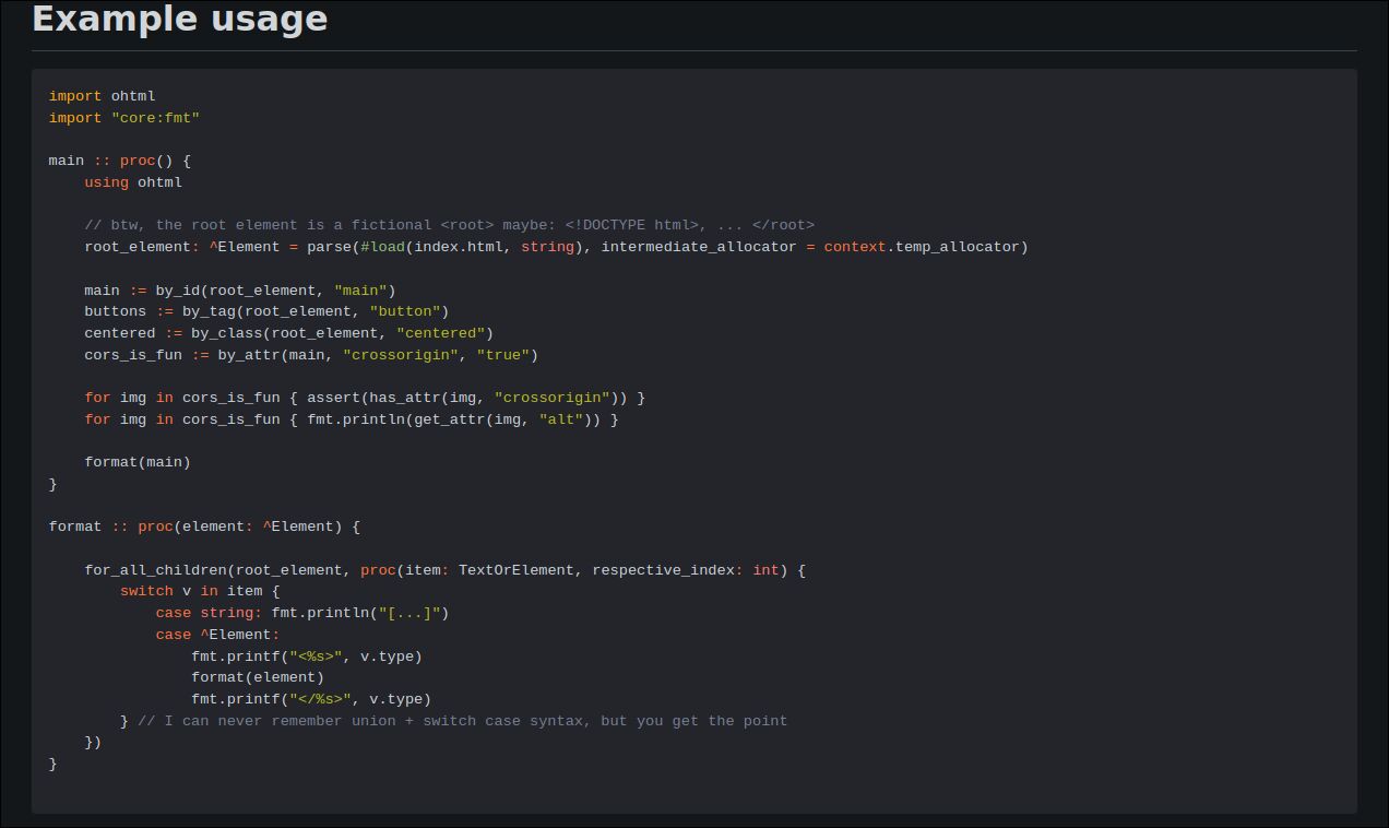 In the words of me when I finished it: "A loosey-goosey HTML parser for the Odin programming language," there is not much more to it. It isn't just an XML parser (it knows self-closing, void & block element types, has element search helper functions and more.)