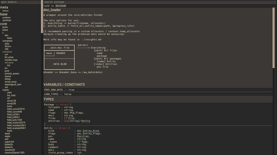 A viewer for the documentation of the Odin programming language. With a custom syntax highlighter, document format wrapper, ui "library" and much more. This is one of my biggest projects and it is still far from finished.
