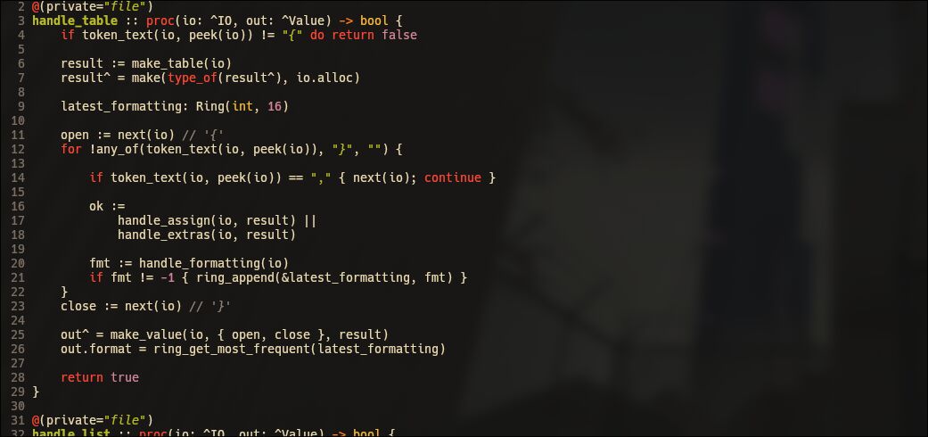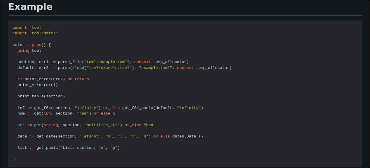 This is my most used project by far. It is a spec-compliant TOML parser library for the Odin programming language. I created it a while back and by now am relatively close to releasing utoml (another TOML parser for Odin, although not a replacement per se)...