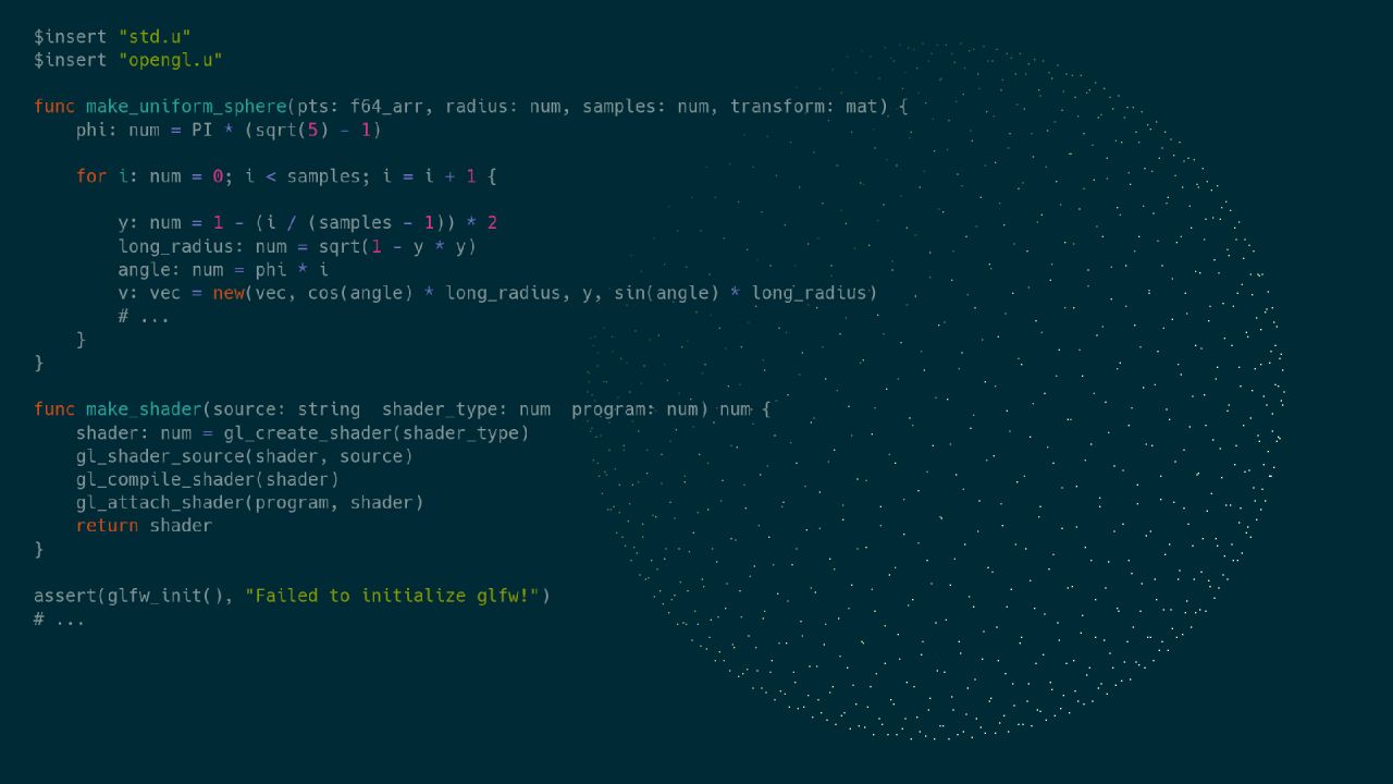 An old interpreter I wrote for my own relatively simple recreational programming language in Java. I wrote my 3D demo with OpenGL1 1 Technically, LWJGL -- LightWeight Java Game Library, which has Java bindings for OpenGL, Vulkan as well as many other native graphics and audio APIs. , so it could certainly be a usable programming language, if it had a more proper foreign function interface. Ulang also has an integrated AST viewer, that receives UDP packets (it's a local network, okay!)